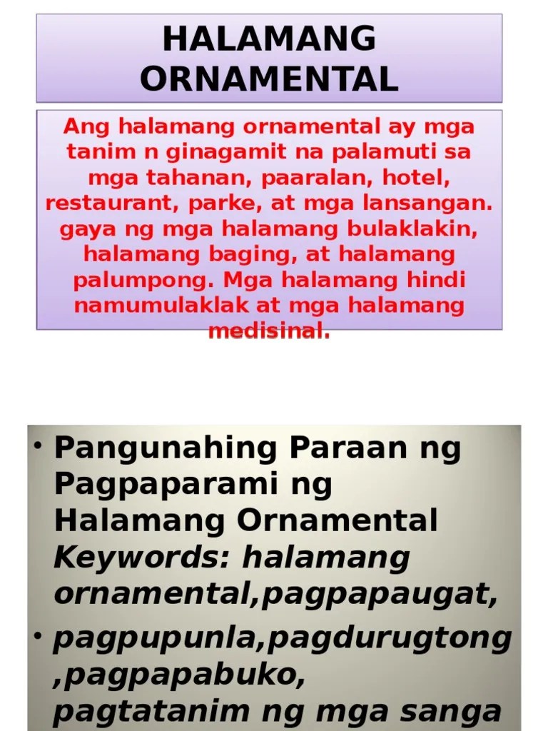 Balikan ang nagawang talaan ng mga halaman punong ornamental. Deped copy 344 marami ang dapat isaalang alang sa pagpili ng halamang punong ornamental upang ang magiging kapakinabangan nito ay makabuluhan. Ang mga halamang ornamental na mababa ay itinatanim sa gilid sa kanto o sa gitna ng ibang mabababang halaman. By proceeding, you agree to our privacy policy and terms of use.